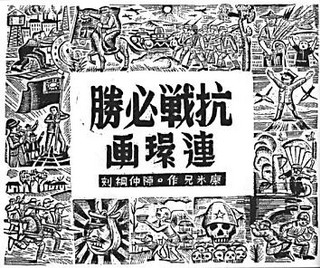 《抗战必胜连环画》封面上在标明“廖冰兄作”的字样外,又郑重地标明:“陈仲纲刻”。陈仲纲先生亦为广东人,三十年代初与李桦先生一起从事木刻运动,参与创作编辑出版《现代版画》。抗战期间,辗转西南,以画笔从事抗战宣传。廖冰兄这本画册,就是他自己根据展出的布画缩小绘制在二十五开白纸上,再由木刻家陈仲纲复制于木版,运刀镌刻,再上机印制而成。陈仲纲先生熟于运刀向木,又熟悉冰兄作画的朴拙风格,因而,虽然受限于木版幅面,也还是不失原作神韵。抗战期间,印刷物资匮乏,锌版制作不易,原始的木刻工艺派上了用场。虽然倒退到原始状态,但反而使刀木趣味同漫画结合起来,别具一种艺术趣味。当年,这类由木刻家或刻字师傅参与的出版物不少,但大多是仅署漫画家之名,木刻家或刻字师傅隐于幕后,很少为人所知。《抗战必胜连环画》是一例外,难得!