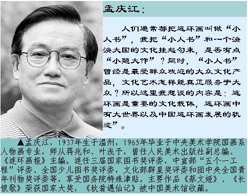 要谈连环画,首先要谈谈文化,因为连环画是文化的重要载体。“文”者,美也。《礼记》有云:“五色成文而不乱”。把多种颜色有规律地组合在一起,显示了美,这就叫做“成文”。“化”者,教化也。指的是对个人或世俗风情的教行。可见,文化是指人类对美好事物的向往和追求。这种追求的成果,表现为科学、艺术、宗教、道德、法律、风俗、习惯等等,这就叫做人类的文明。人类从野蛮到文明,有个漫长的历史进化过程。历史文明的传承,是靠实物(如建筑、器皿、营造、工具等等)和思维活动的延续来进行的。人们的思维活动又有“文字语言”和“形象语言”两种。文字,最早带有形象的特征,发展到现代,绝大多数已抽象化了。我们所说的“形象语言”,一般是指可视性的语言,例如戏剧、舞蹈、绘画等(动作、表情最能传达人的思想内涵)。在历史长河中,绘画是最容易被人们接受,用它表达思想、交流感情。由于媒介与技术手段的不同,出现过诸如岩画、漆画、壁画、木板画、绢画、瓷画、铁画等等绘画种类。连环画只是区别于单幅画的表现形式,它的多幅连环性、构筑了自身的“绘画语言”特点,是它把人们的思维过程淋漓尽致地加以表达,人们的思维除了抽象的内涵必须用文字加以说明外,一般会在自己的行动以及由行动构成的“情节”来体现的,所以用图文互补的连环画形式,是人们传递文化的最好载体。只要历史在发展,文化在传承,从宏观到微观,连环画的形式就永远会被运用着,只有它的创新和变化,而不会有它的消失,这个客观存在的文化现象,谁也无法否认。