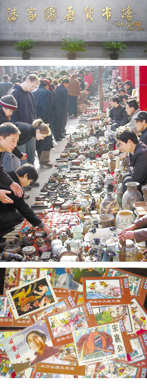 在潘家园旧货市场中,最吸引我们的想必是那些连环画(俗称“小人书”)了。这些在上世纪80年代卖几毛钱的“小人书”,在今天的潘家园旧货市场上都可以卖到几百、几千元。连环画是中国传统的艺术形式。最早的连环画是长沙马王堆出土的西汉故事画。到了清末有了石版印刷,连环画艺术也逐渐走向成熟。到1929年,因受有声电影的影响,连环画上开始出现了人物语言。而在1932年以后,连环画才红火起来,朱润斋、周云舫等名家都是在这一时期涌现出来的。1949年后连环画发展进入高潮期。这时的小人书大多以土地改革、爱国增产、抗美援朝、宣传宪法、婚姻法等国家大事为题材。一些古典名著、历史故事、民间传说的古典题材小人书也以质优而受读者欢迎,代表作有《三国演义》、《水浒》等。但随着社会的发展,“小人书”也逐渐被人们所遗忘,很多80后的青年都没有看过这些书,而且现在能看到这些书的地方更是少之又少,除了一些收藏者的家里,在北京恐怕只有在潘家园旧货市场的“小人书”区能看到了。此外,在潘家园市场上还有许多经营古旧书画的摊位,这些摊位上有很多各个年代的宣传画,这些宣传画是我国影视作品中反映时代特点的重要道具,也正因此,成为一些人收藏的对象。