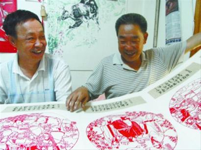 昨日,在陈凤麟老人家中,陈凤麟(左)和马跃权正在 《三国演义》剪纸连环画旁总结经验,他们还要以此种形式创作其它三大名著。