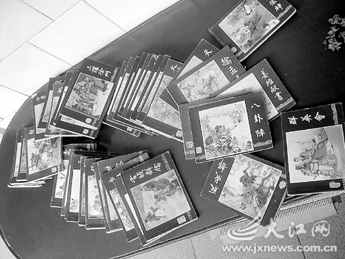 走进位于新余钢厂铁山村徐秉余家,一摞摞、一排排小人书映入眼帘。《三毛流浪记》、《鸡毛信》、《阿Q正传》、《孙悟空三打白骨精》、《西厢记》,令人感觉时光仿佛又倒退了几十年。还未说话,徐秉余就习惯性地拿起毛巾,轻轻拂去书上的些许灰尘。10年的痴迷,让他拥有1500多册小人书,在新余收藏界首屈一指。和小时候一样,徐秉余如今最喜欢的休闲方式,仍是闻着小人书的淡淡书香,细细欣赏、把玩。