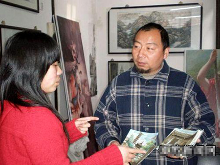 王平先生向记者介绍水彩连环画《白蛇传》
