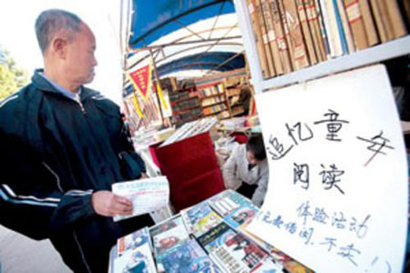 图为一位老大爷在只借不卖的摊位前驻足观看