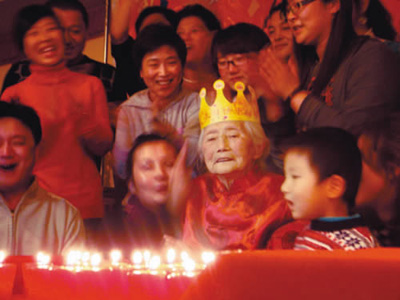 伴着悠扬的生日歌,宴厅里亮起一只只红蜡烛,它们被捧在一百人的手里,组成了“寿”和“100”的形状。歌曲完毕之后,一位穿着红色小袄的百岁老婆婆缓缓走来……昨天,在大东区国巍饭店里,举行了一场别具特色的五世同堂生日宴,100名子孙给百岁老人于桂卿贺寿。年龄最大的贺寿者是于桂卿的大女婿,80岁,年龄最小的贺寿者刚刚百天。赶来祝寿的人分别来自齐齐哈尔、大庆、大连、沈阳、承德等四省五市。神奇的是:在场的人面貌都很年轻,一位从大庆来的老人的外孙女52岁了,看起来却只像30多岁。百岁老人虽然100岁了,但是牙齿都没掉,榛子一咬一个,每天仍洗衣服、刺绣……而老人长寿的原因,被归结于拥有良好的心态,“没脾气,心态平衡”。饮食方面,于桂卿老人也持着“顺其自然”的态度,没什么忌口的,有什么就吃什么。年已百岁的老人爱好广泛,剪纸、绣花……不识字但酷爱看小人书。