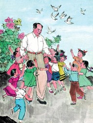 1958年秋冬之交,报上刊出毛主席参观河南新乡七里营幼儿园的新闻,当时,我在少年儿童出版社《小朋友》编辑部主持编务,感到这是个人民领袖爱孩子的重大题材,于是专程到七里营幼儿园采访,详细了解了毛主席到七里营幼儿园的全过程。回来后,我据此写了一个十六小节的小故事,编辑部领导看了脚本,非常重视,认为可以配成连环画作为重点书出版。于是我们特地约请了曾给少儿社画过《哪咤闹海》的著名画家程十发来画这本连环画,程十发看了这本反映领袖和小孩之间的至爱亲情的脚本,也非常重视,数易其稿地把画稿画出来,还请我这个文稿作者一同参谋,看看哪些画得最生动,哪些还可作进一步的修改,怎样把领袖的形象画得更亲切,更慈祥。