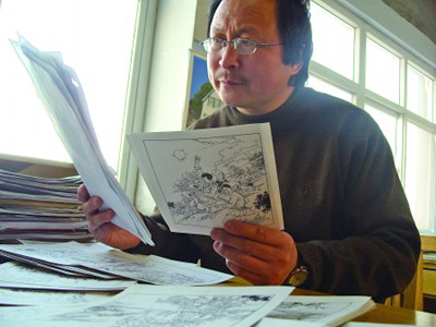 记者在办公桌靠墙的一侧看到,桌边堆放着两摞用麻绳捆着的《学习报》,每一摞都有半人多高。“这些是连续十年为《学习报》的英文版配连环画插图的‘成果’,每期发表的作品都会收藏起来,包括为《中国连环画》绘制的趣味小故事等近万幅已经发表的作品。”孟宪民说。谈及最近的工作更让孟宪民感到自豪,他说近期主要是为新泰平安协会画一些以农村平安和谐宣传为主要内容的连环画,并将用“瓷绘”的形式刻画在新泰市多个县市区村的宣传栏上。“相对于以文字为主的明白纸,大部分的农村老百姓还是喜欢看画,直接明白,又有教育意义。”孟宪民说。除了绘制具有和谐教育意义的连环画外,一些科普法律知识之类题材的连环画也成为孟宪民近期开辟的新天地。他称,以前就是把连环画当作一个爱好,宣传教育也就是用在针对学生这一群体上,现在一些农村和谐平安的教育上也有了“用武之地”。