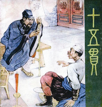《十五贯》堪称王弘力连环画的代表作,故事是根据同名昆曲改编绘画的。虽然,整部连环画作品只有54幅图,但惜笔如金的大师,却成功地塑造了况钟、尤葫芦父女、娄阿鼠、过于执等众多人物,大师以近连环画一半的篇幅来重点塑造清官况钟这位主要人物,而其他人物的塑造和描绘也都各具特色,生动传神。《十五贯》能从几百部评奖作品中脱颖而出,斩获头奖,是王弘力对连环画艺术长期探索、努力和不懈追求的最好证明和褒奖。