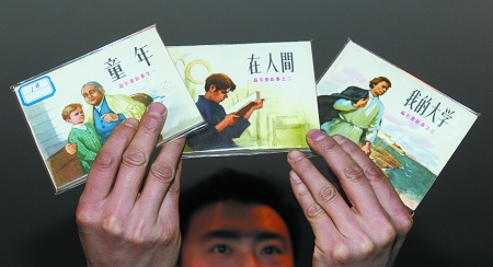 昨日,工作人员展示参加拍卖的《高尔基三部曲》连环画。