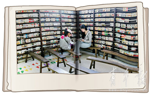 现场有几个“80后”的家长向记者反映,黑白的连环画面对孩子们很难有吸引力,倒是他们,经过这个书架时,心头总会瞬间柔软起来,一下子拾回“童年”的记忆碎片,忍不住要上前翻上一翻。“我也让女儿来翻过,但是小家伙没定力,看不上几分钟。”小佳的妈妈认为,连环画是通俗美术读物,也是一个时代文化生活的生动缩影,只不过,连环画早已敌不过彩色的现代儿童读物对孩子的吸引力了。