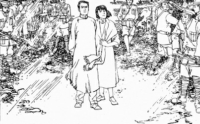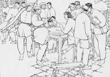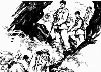 接到连环画《红日》创作任务,时年三十多岁的汪观清打起背包,立即去涟水、莱芜、孟良崮等解放战争主战场考察,向当年支前的老乡请教;结合满山大石块上留下的弹痕、石缝里锈蚀的弹壳,在脑海中“复原”起当年的战争场景。“第一次去孟良崮是在1961年的五六月间,正好是炎热的夏季,孟良崮又是自然灾害的重灾区,当时只能一天两餐,每餐限二只窝窝头,仅靠凉水陪餐。”三十多天采风后,汪观清虽消瘦了许多,积累的素材却越来越多,人物刻画也渐趋丰满。