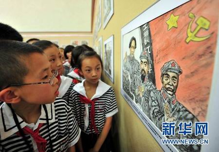 6月23日,在甘肃庆阳市体育馆,庆阳师范学校附属小学学生在参观《红色南梁——陇东革命故事连环画》展。革命老区甘肃省庆阳市是原陕甘宁边区主要组成部分,1934年11月创建了西北第一个苏维埃政府——南梁政府。以南梁为中心的陕甘边革命根据地,是土地革命战争后期全国“硕果仅存”的革命根据地,为党中央和红军提供了落脚点,是八路军三大主力部队开赴抗日前线的出发点。甘肃庆阳市委党史办撰写文字脚本,邀请17名知名画家用近一年时间精心创作而成《红色南梁——陇东革命故事连环画》,分20个篇章,共539幅,以国画、油画、版画等艺术形式历史地再现了庆阳老区革命全貌。