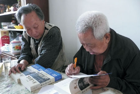 听说老友前来拜访,高玉宝显得格外高兴,与王绪阳紧紧拥抱在一起。据高玉宝回忆,他与王绪阳结识半个多世纪,曾有四五次会面。高玉宝向王绪阳打听《我要读书》的连环画现在为什么在书店里很难看到,王绪阳告诉高玉宝,这两年出版社的出版量不大,去年朝花少年儿童出版社再版过,出版社给他寄来了5套,回沈阳后一定给高玉宝寄来一套。王绪阳还告诉高玉宝,1952年他为创作《我要读书》连环画时画的高玉宝的父亲高学田的素描至今还保存在家里,一定寄来一幅给高玉宝留作纪念。交谈中,高玉宝将原中央人民广播电台记者莫树吉前些日子出版的长篇报告文学《真人高玉宝》一书郑重的签上了自己的名字,送给了王绪阳留作纪念。