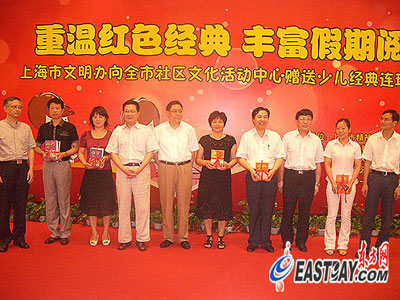 东方网记者项颖知7月7日报道:暑期已至,如何让放假在家的孩子们过一个开心又有意义的假期牵动着每个家长的心。今天下午,上海市文明办在浦东周家渡街道社区文化活动中心向全市社区文化活动中心赠送了少儿经典连环画丛书,为广大沪上青少年奉上一场饕餮阅读盛宴。