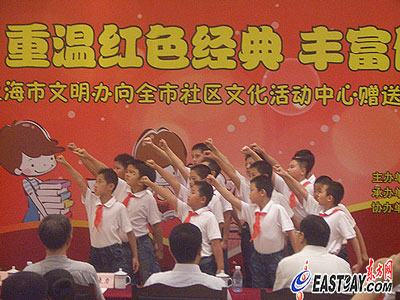 赠书仪式上,来自浦东新区青少年活动中心的孩子们表演了诗朗诵《祖国,我亲爱的祖国》和《少年强》两个节目,他们声情并茂的演出打动了每一位观众,赢得了满场掌声。