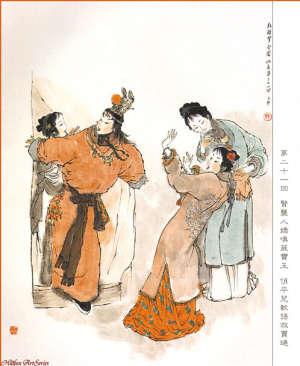 《红楼梦》,戴敦邦持续画了20多年,也研究了20多年,他还是中国红楼梦研究会的会员。尽管如此,每有新作,依然极其严肃、认真。在创作“新绘红楼梦”时,出于对用画诠释《红楼梦》的负责态度,他对原来绘制的后四十回草图不甚满意,竟然将其全部推翻,重新构思。为这部画稿,几年里他几乎回绝所有外出活动,甚至患病期间,依然捉笔勾勒,不敢懈怠。每每咳喘不止,便以背部撞击门框五十下,以平喘顺气,后继续作画。