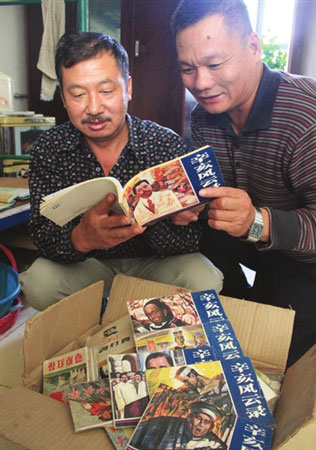 孙瑞民(左)正与朋友一起欣赏小人书《辛亥革命风云录》。