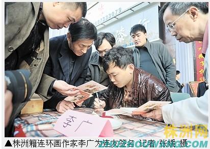 而在画家李广、何汉秋、肖中仁的签售台前,一位手拖旅行箱、肩背旅行袋的老人,手拿李广的绘画《佛衣会》,等待签名。