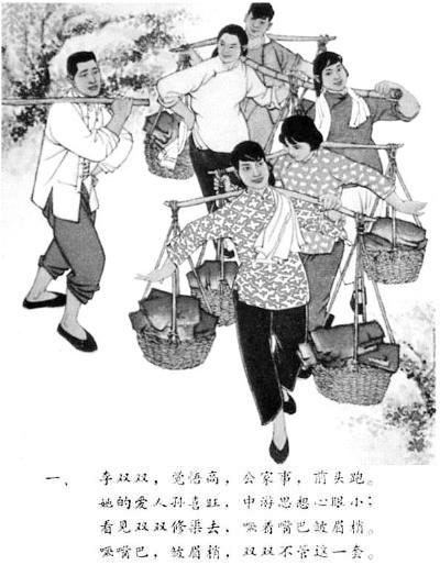 他对绘画语言的提炼功夫,能使他的个性发现变成作品后又成为有共性的内涵,这个转换就是艺术再现的能力。譬如在《李双双》中,丈夫喜旺和双双闹矛盾,离家一个多月回来,以劈柴表示内疚求得老婆原谅。双双回家看到,知道他是以此道歉,就说:“家不会开除你。”如何将这句文学语言转化为绘画语言,是很难的,这句话怎么画?贺老想到了一串钥匙,让李双双将钥匙交给小孩,叫小孩递给她爹,说明你可以进家门了。钥匙作为一种家的象征,一种绘画符号,很自然就形成了画面,合情入理。这就是:“通过看得见的,表现看不见的。”