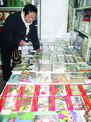 这时从门外挤进来一位老奶奶,她说今年已经快80岁了,她也是看了扬子晚报后来的。“我不太懂,也不知买哪些品种,是为孙子买的,他在深圳,我买了给他寄去。”热情的张先生随即帮她挑选起来,他首先推荐的就是贺友直的《山乡巨变》,“这可是‘小人书’中的代表作,画得极好,百看不厌。”接着张先生又拿起一套10本装的《铁道游击队》。王奶奶又买了刘继卣的《水帘洞》、《闹天宫》,沈尧伊的《地球的红飘带》等传统题材,大部分是平装本,背了一大包,满心欢喜地离去。