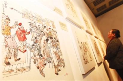 昨日,一名观众在展览上观看反映老上海生活场景的画作。当日,九十高龄的中国连环画泰斗贺友直的个人画展《率真贺友直·经典老上海》在上海城市规划馆揭幕,展览呈现了贺友直近10年来的连环画新作,这些作品用白描的手法生动展现了老上海的各色人物和世间百态,人情冷暖、美丑妍媸都活灵活现、跃然纸上。贺友直1952年11月进入上海人民美术出版社从事连环画创作,他的《山乡巨变》被称为中国连环画史上里程碑式的杰作。