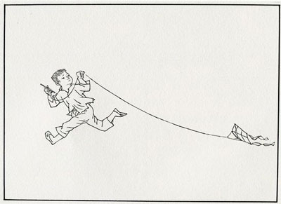 本版图片选自贺友直系列作品《我来自民间》。贺友直对每幅作品均有自述,这一作品的自述是:“在农村里,穷人家的孩子是不知道有玩具的,要玩只有自己做。可我做的风筝从没上过天。”