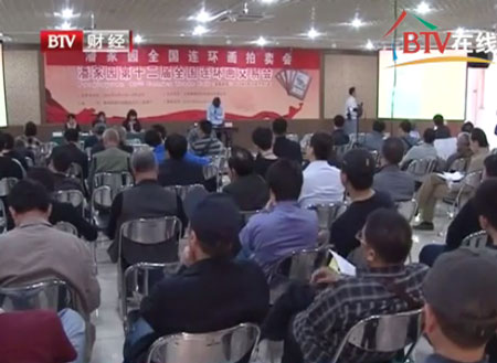 北京电视台报道 拍卖探身价,全国连环画交易正式举槌,每届的全国连环画交易会都是连环画爱好者的一大盛事,今年适逢第十二届又赚回了北京的潘家园,瞧瞧拍卖现场几乎是座无虚席,起拍价从几十元到上万元不等,就说这本《杨门女将》当年不过一两毛钱,如今起拍价就得300,翻了近3000倍,您再瞧这本98品相的《穷棒子扭转乾坤》,大师刘继卤之作,1963年出版的,1000的起拍价一出场就在藏友间掀起了一番激烈争夺。最后这本连环画以4500元的高价成交,成为本届连环画交易会的拍卖明星。