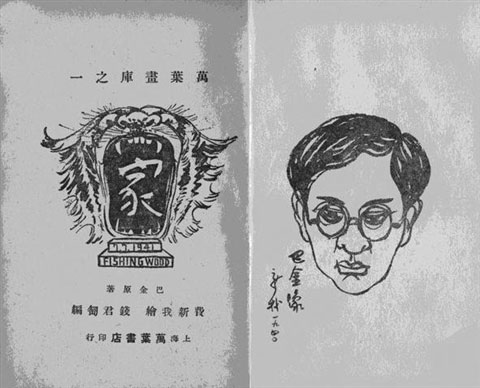 我喜欢这本书首先是细节上比较讲究,淡绿色的封面上,一个红红的“家”字特别醒目。主画面是一只巨大的蝙蝠,张开大爪子扑向一张小小的古琴,琴边写着“五千”两个字,大约代表着五千年的文明,一幅危在旦夕的紧迫感油然而生。扉页右页是费新我1940年为巴金画的像,戴着眼镜,目光向下看着,似沉思,又有一种忧郁感。第2页和第3页,作者连画两页《家》的人物头像,画出《家》中24位主要人物,形形色色,表情不一。这等于是《家》的人物谱了。