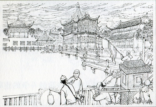 王亦秋:上海老城厢啥样子,我也没看到过,历史照片都是东一张西一张残缺不全的。有一次我去浙江东阳,觉得很精彩,护城河上面的桥头和城墙距离很近,说话都能听见,我心想,原来城墙和桥还可以起到这种作用。后来画《小刀会》,我就借用了这一处。我想以前上海县城同浙江的县城不会相差太远,在桥当中可以和城墙上的人对话,情节就可以这样安排了。我从小生活在城隍庙附近,看过的犄角旮旯零零碎碎的东西也蛮多的,有时候我就把记忆里的东西画进去。