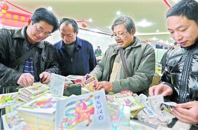 昨日,全国大型连环画精品展在硚口崇仁路收藏品市场揭开序幕。活动除了连环画精品展示外,还有连环画拍品预展、湖北连环画名画家藏品签名等内容,吸引了全国各地“连友”300多人来汉参加。图为连环画家何汉秋(右二)正在为自己的手绘连环画十八罗汉系列故事签名。 记者梁超 摄