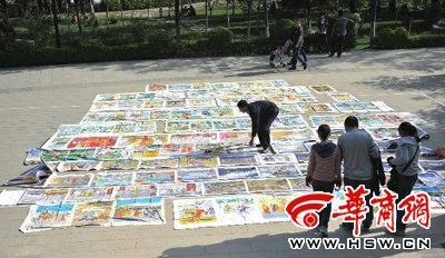 确实,他的画太长,昨日下午,用了半小时,他才在西安丰庆公园找到一个可以好好晒画的地方。