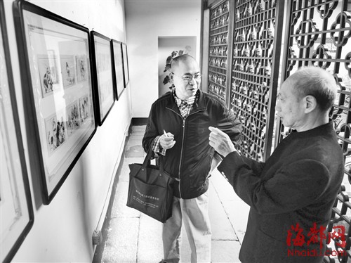 李舒云(右)向参观者讲解自己的连环画