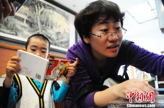 一名母亲在书堆里挑适合儿子阅读的连环画,一旁的儿子在认真地阅读。 吴瞳 摄