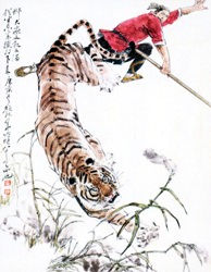 三年前,颜梅华先生以84岁的高龄,用国画的笔墨和技法创作了连环画《武松》,绘有三个故事:《武松打虎》、《阳谷除霸》、《十字坡》,共44幅。画得生动精细,侠气豪放。许多“连友”议论纷纷,因为他们知道从上世纪80年代中期,颜老开始致力于中国画创作,并已逐步形成独树一帜的艺术特色,其人物、山水、花卉被誉为“颜氏三绝”,怎么又来创作连环画了?