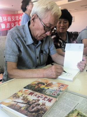 大连本土画家阎峰樵在签售新版小人书。