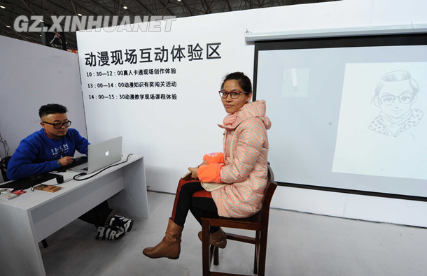 11月22日,一家文化科技公司的一名画家在第七届亚洲青年动漫与数字艺术大赛暨中国(贵阳)数字产业投洽会上为一名女观众画肖像。新华社记者 杨楹 摄