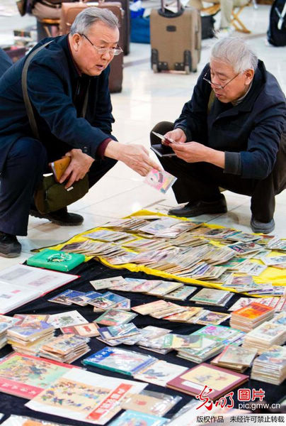 2014年4月3日,北京,连环画爱好者在交易会上挑选连环画。