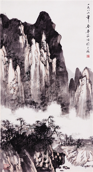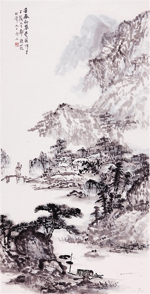 2013年年底,老师99岁岁末创作了一幅山水画黑白稿,2014年年初敷色,作品完成后,他喜不自禁地说:“2014年,我再画一幅百岁的作品。”当2014年新年钟声敲响,老师走进画室挥毫创作了他的世纪之作,也是他的封笔之作。