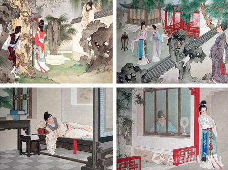 这个可以从《听琴》来反映,可以从画的背影来反映,一看这是大家闺秀,她是一个很洁身自好的主人公,但是她反封建追求爱情。《听琴》里头反映她很有修养,必须得读懂琴才能画出真正有内涵的作品。她这画里最大一点就是人物跟环境搭配得非常好,欣赏他们的画,我们就是要欣赏她对人物的刻画,服饰、人物跟环境的关系。比如张生,一个文人竟然能跳枪过来,为了爱情,穿着大袍子跳墙,她画的爬墙头,在画里反映的是他对爱情的一种追求,我来相会了这么一个表达。
