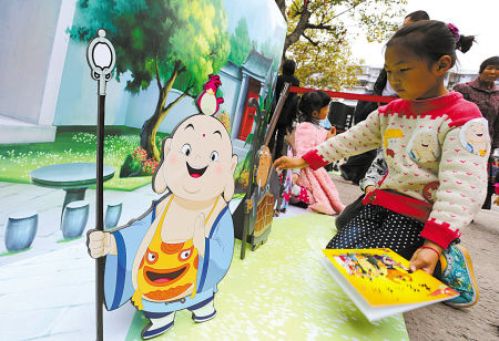 近期,动画片《布袋小和尚》在央视热播。昨日,制作该动画片的大慈文化传播有限公司在海曙区南塘老街向一批小朋友派送精美的《布袋小和尚》连环画册,并现场表演“做好事、说好话、存好心”的“布袋三好操”。图为一小朋友手持连环画,对着“布袋小和尚”图展墙揣摩。