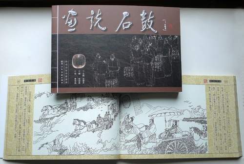 出土于宝鸡石鼓山的十面石鼓是中国第一古物,石鼓文是中国现存最早的石刻文字,石鼓诗是中国古诗仅见的原勒真迹,亦为书家第一法则,是中华珍重的文化遗产。石鼓印社为将专家学者的研究成果推向社会,让普通百姓了解熟悉中华石鼓,石鼓印社的创职人员历经三年努力,将石鼓文改编为通俗易懂的连环画册,这是迄今为止我国首部石鼓文通俗读物,它的公开出版发行将有利于广大群众尤其是青少年儿童对石鼓文的了解和学习。《画说石鼓》由陕西人民美术出版社出版发行,北京大学的专家学者为画册题词,西泠印社领导写诗赞赏。