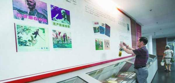 近日“图绘世界——中国百年连环画展”在国家图书馆总馆北区一层开展。图为观众在展板前驻足观赏、拍照。