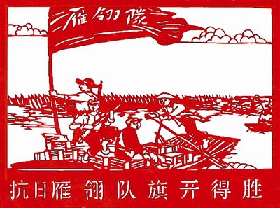 其中,首幅剪纸主题作品《抗日雁翎队旗开得胜》,是刘汉源根据本报6月25日《95岁雁翎队成员杜仲奎 潜伏敌营智歼伪司令伪县长》的报道,构思设计出的6个一组的图样。包括:天津保定有一支抗日雁翎队、鬼子进入埋伏圈、雁翎队用渔叉插鬼子小队长、鬼子被打得哭爹喊妈、打得鬼子望风逃窜、雁翎队消灭鬼子占领运输船。曹彩霞据此用剪刀刻画细节,用独特的剪纸语言形式再现白洋淀军民的抗日雄风。