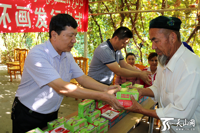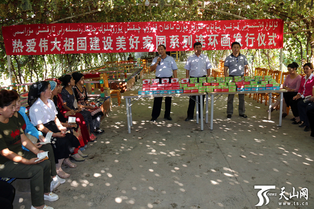 吐鲁番市高昌区葡萄镇工作人员为社区居民免费发放连环画。 9月17日,自治区党委宣传部启动2015年“热爱伟大祖国 建设美好家园”系列连环画发送活动,114万套连环画将陆续免费发送全区各县、乡镇等基层单位,重点发到各农村文化室、农家书屋及农村“十户长”家中。 “热爱伟大祖国 建设美好家园”系列连环画(口袋书)进村入户行动,是自治区加强意识形态领域工作的重要举措。此项工程由自治区党委宣传部组织实施,从2012年起围绕“爱国无上光荣”、“奋斗改变命运”、“民生连着民心”、“愚昧遗恨终身”、“伊斯兰教是倡导和平团结的宗教”、“教育是社会进步的基石”六大主题,组织相关部门编印基层群众喜闻乐见、通俗易懂,具有典型性、思想性、可读性的系列连环画,深受基层群众喜爱。截至2015年,共编印发送系列连环画8套67本7558万册。 9月17日10时,在自治区新华书店教材发行物流配送中心,工作人员正在分装 “热爱伟大祖国 建设美好家园”连环画,并将已经分装好的连环画装上货车,运往全疆各地州。 当天,吐鲁番市高昌区葡萄镇的社区居民阿依努尔·吐尔逊就在农家书屋看到了新送来的连环画,立刻翻阅起来。“连环画简单易懂,老少皆宜,而且还是双语的呢。” 随后,记者在吐鲁番市客运中心看到工作人员将一套连环画送给了准备乘车的玉素甫江·艾来提手中。玉素甫江·艾来提手捧连环画,边翻阅边激动地说:“太好了,我一定会认真阅读这些连环画的。我没有上过学,书报都看不懂,这些连环画我却是一看就明白了,可以了解更多的信息与知识,我还要让我的孩子跟我一起读。” 2015年“热爱伟大祖国 建设美好家园”系列连环画共编辑出版2套16本(每套8本),各印制114万套(维汉文110万套、汉哈文4万套),两套同时发送。连环画围绕聚焦庆祝自治区成立60周年,编印了《辉煌60年》、《听老将军讲故事》、《放飞梦想》、《红光村的变迁》等,从不同角度、不同侧面,反映自治区成立60年特别是中央新疆工作座谈会以来,新疆经济社会发展取得的辉煌成就和天山南北发生的翻天覆地的巨大变化;选取阿布列林·阿不列孜、肉孜麦麦提·巴克、阿西木·依不拉音等群众身边的先进典型故事,编印了《做焦裕禄那样的共产党员》、《准噶尔的“油巴郎”》、《“万帮”有个阿西木》等,充分发挥群众身边的先进典型引领带动作用;围绕当前新疆意识形态领域反分裂斗争形势,编印了《揭开“伊吉拉特”真相》、《远离宗教极端思想》、《我们不能被蒙蔽》、《从歌声中觉醒》等,充分考虑受众特点,用讲故事的形式“去极端化”,引导基层群众确定正信、抵制极端。