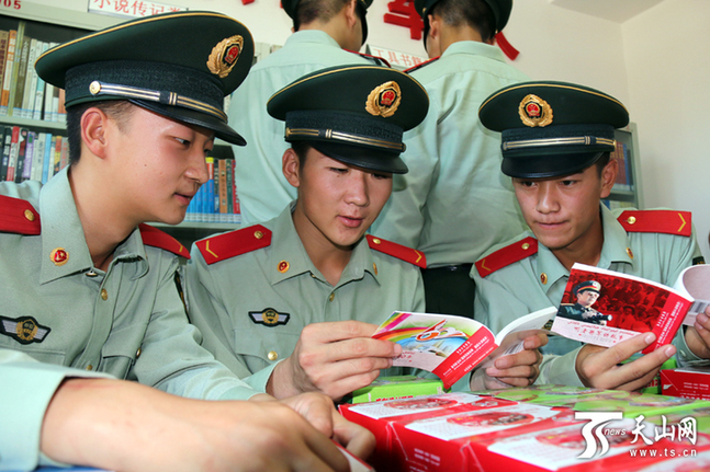吐鲁番市武警支队第四中队的官兵正在阅读“热爱伟大祖国建设美好家园”系列连环画。