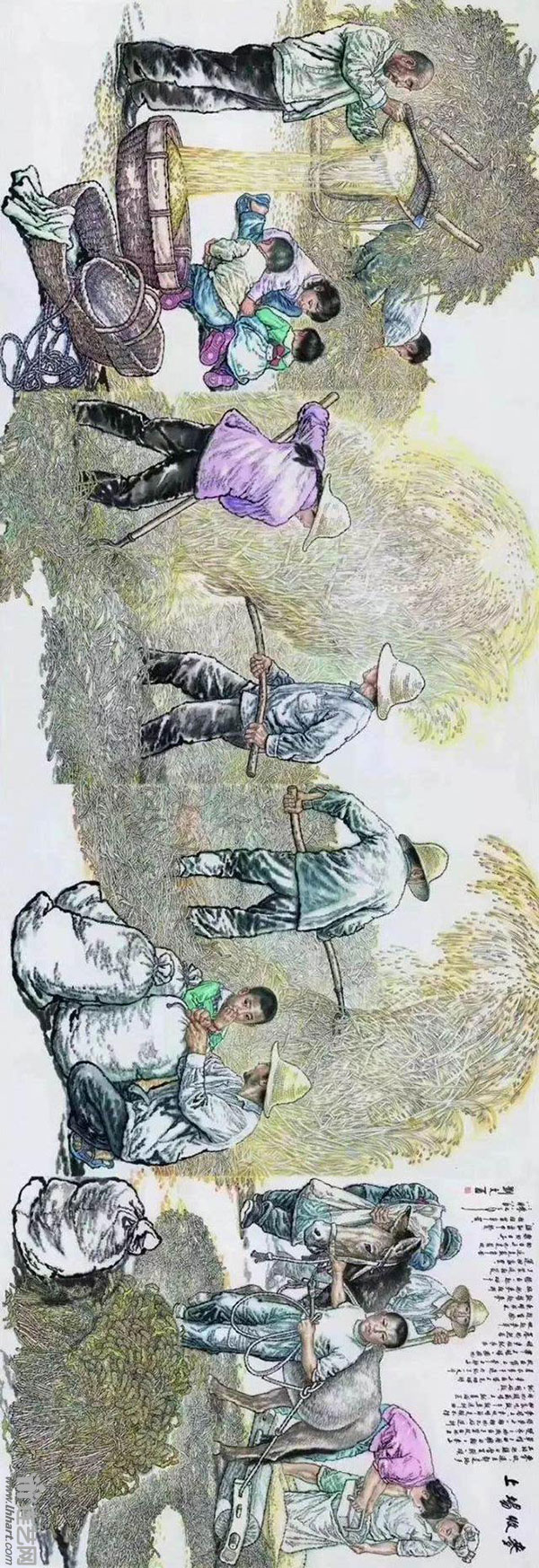 你会看见,在《麦收场上》画面中,展现了辛勤劳作的农民挥洒汗水躬身劳作的场景,将北方汉子的憨厚、淳朴在挥洒自如的笔墨下跃然纸上。在老农形象的描绘上,多用焦墨干皴,染以淡墨表现结构,最后赋彩润色之,色墨结合恰到好处;画女孩形象则重染色,能够用不露笔痕的饱色表现陕北女孩的清新圆润。