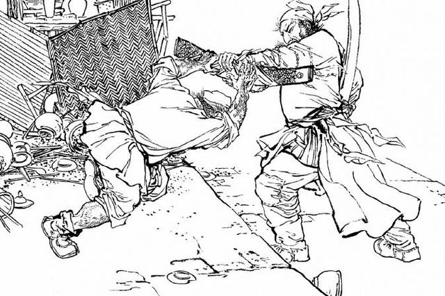 王弘力先生画笔下的杨志,身材高大,衣衫破旧,低眉垂首,显出十分失意和消沉的姿态,当他被牛二撩拨得心头火起,挥刀夺命之时,才显出强大的力量感,杀了牛二之后,又立刻回到低声下气的姿态,请求围观人等作证。
