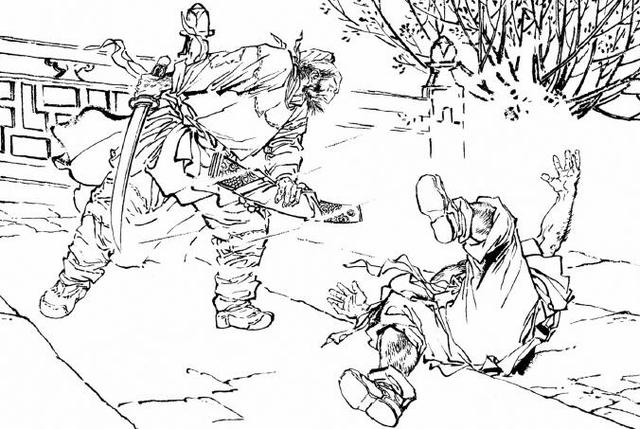 杨志抱紧宝刀,默默低首,显出万般的无奈和难为情。